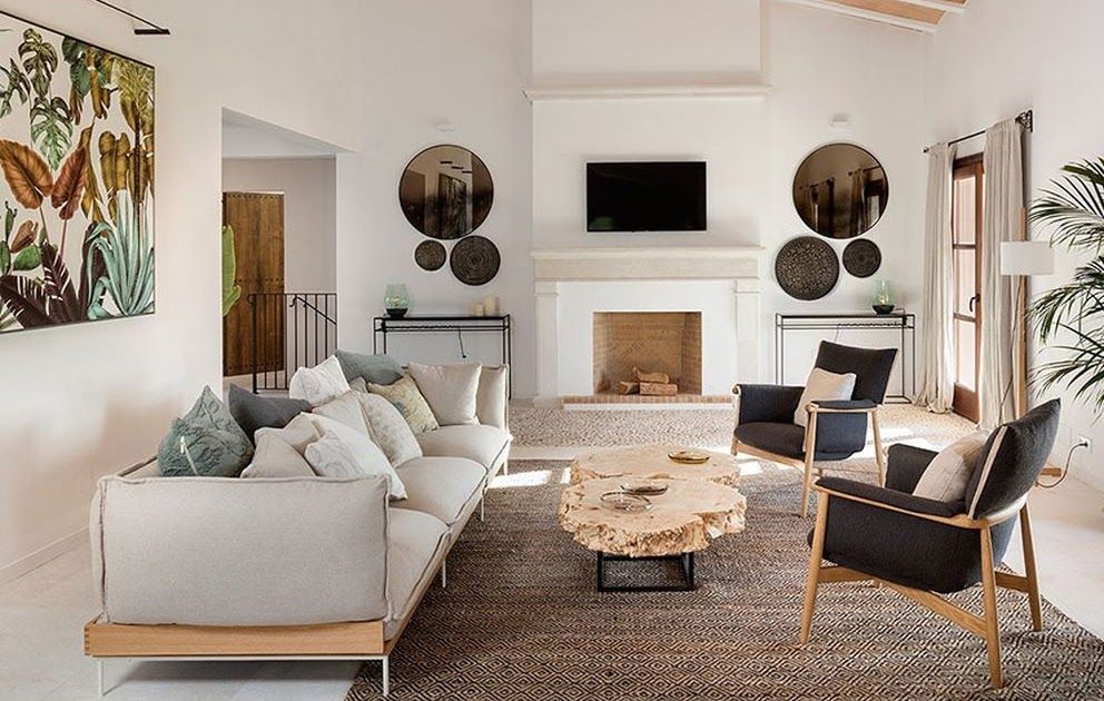 La espace de vie est lumineux et spacieux, avec de grandes fenêtres donnant sur le jardin. Une cheminée centrale raffinée ajoute une touche chaleureuse, pour vivre dans la maison non seulement en été. Une série de miroirs et des plateaux ronds encadrent la cheminée de part et d'autre et reflètent de manière créative la lumière naturelle. Un canapé et deux fauteuils au design nordique sont flanqués d'une table basse fabriquée localement, tout comme le grand tableau aux feuilles tropicales.