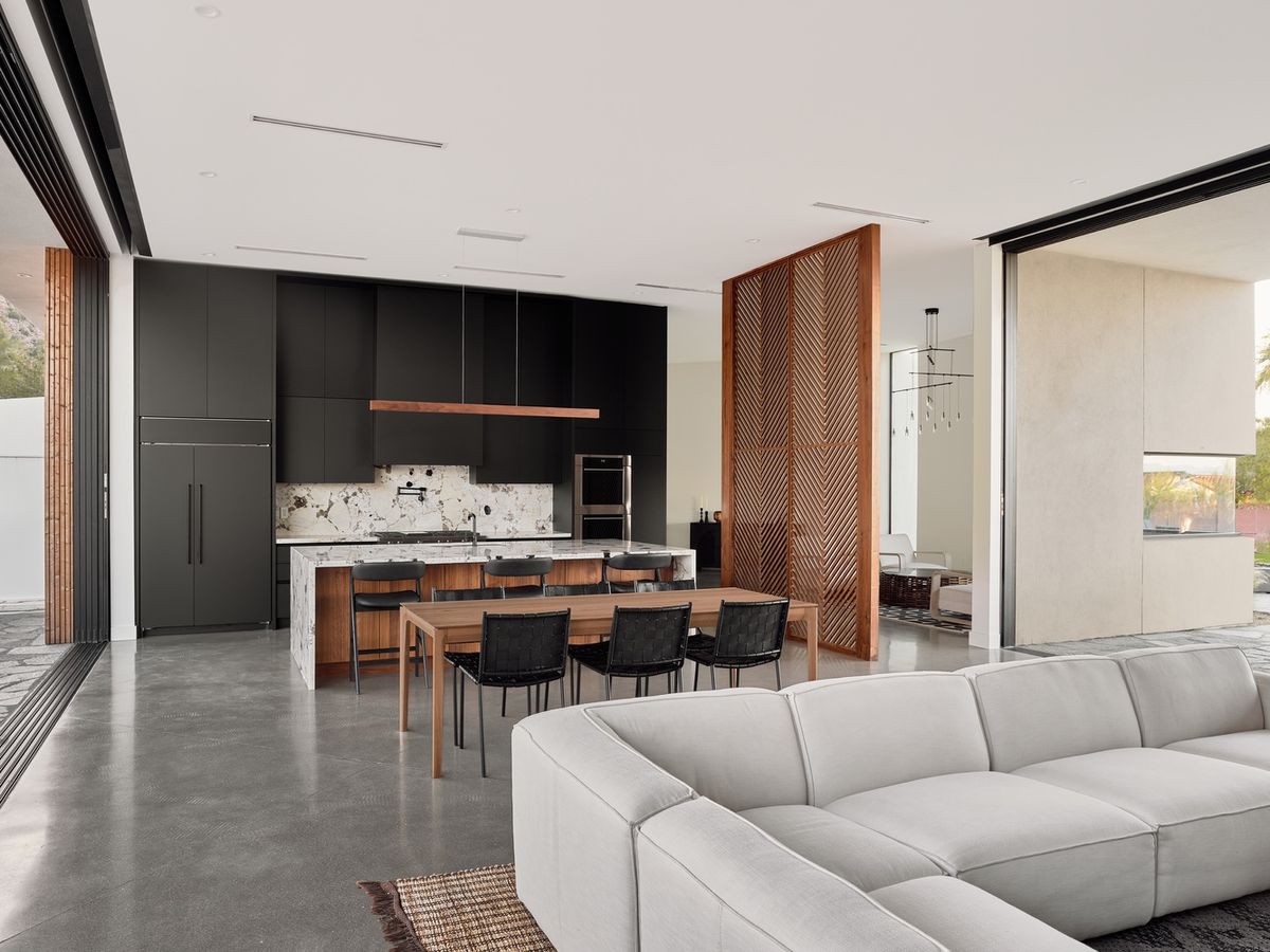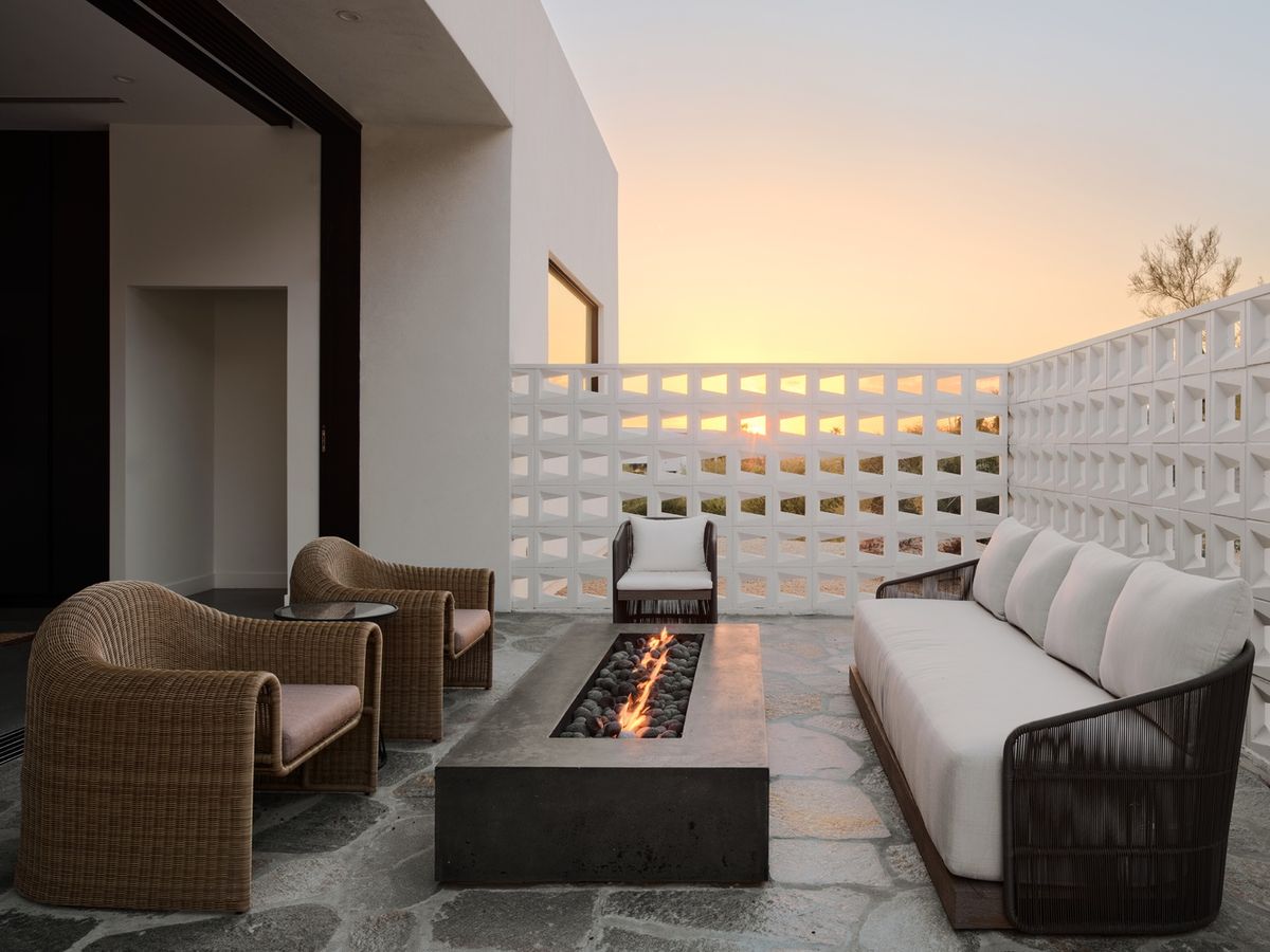 La disposition des espaces a été soigneusement étudiée pour offrir des vues panoramiques de Camelback Mountain. L'espace de vie, avec ses portes pleine hauteur qui s'ouvrent sur les patios avant et arrière, crée un mélange harmonieux entre l'intérieur et l'extérieur. sur les patios avant et arrière, crée un mélange harmonieux entre l'intérieur et l'extérieur. L'aménagement du patio s'inspire clairement du style distinctif du célèbre voisin. voisin renommé.