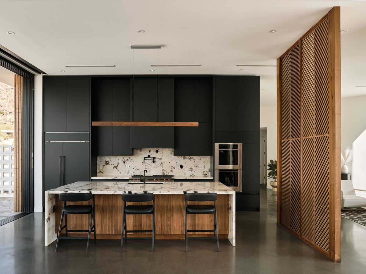 Les sols en béton, le plâtre dans les salles de bains et une combinaison d'armoires en noyer, en chêne blanc et en noir mat créent une atmosphère intemporelle.