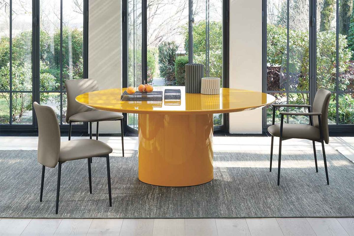 La collection Myon, design Gabriele et Oscar Buratti pour Fragest une famille de tables et tables basses se caractérisent par une simplicité constructive et des formes à forte matrice géométrique. La force gracieuse de son design se traduit par des plateaux circulaires élancés qui contrastent avec des bases cylindriques solides et imposantes. I tables à mangerHarmonieuses dans leurs formes généreuses, elles se caractérisent par une symétrie de composition entre le plateau et la base. Disponibles avec des plateaux ovales ou ronds, chacun en deux tailles, représentent une invitation à la convivialité. La table ronde se compose d'une imposante base cylindrique centrale sur laquelle repose le plateau, 160 et 180 cm, tandis que le plateau ovale, 240 et 280 cm, est soutenu par une double base cylindrique.
