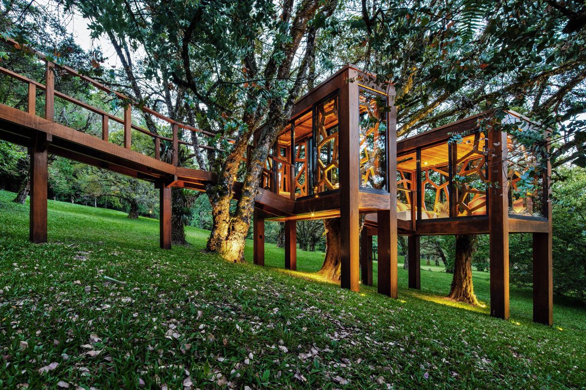 La maison se compose de deux volumes habitables placés entre les branches des arbres. Le premier module, plus petit et mesurant 4 mètres sur 1,5 mètre, sert d'espace d'accueil et de soutien, tout en conservant sa position d'origine. d'accueil et de soutien, tout en conservant sa position d'origine. Le second module Le second module, plus grand et mesurant 4 mètres sur 3, a été a été conçu pour accueillir les activités de permanence et s'est adapté à la pour s'adapter à la torsion des troncs qui changent de position au fur et à mesure qu'ils s'élèvent. au fur et à mesure qu'ils s'élèvent. En plus de ces structures, deux passerelles relient les modules. modules : une plus petite qui relie les deux volumes habitables, et une plus large qui plus large qui relie la Maison de l'arbre à la propriété principale. Les points lumineux disposés au sol au sol révèlent les troncs et les cimes des arbres, tandis que les branches et les feuilles, délicatement éclairées, filtrent l'obscurité. délicatement éclairées, filtrent le ciel sombre qui les surplombe. À l'intérieur, les les lampadaires créent une atmosphère évocatrice, illuminant de bas en haut les les éléments décoratifs de protection solaire de bas en haut. Cette solution ne se contente pas de Cette solution souligne non seulement la vue de l'intérieur vers l'extérieur de la maison, mais contribue également à l'effet de découverte que l'on ressent lorsqu'on se tient debout dans la maison. Elle contribue également à l'effet de découverte que l'on ressent lorsque l'on se trouve à de telles hauteurs.