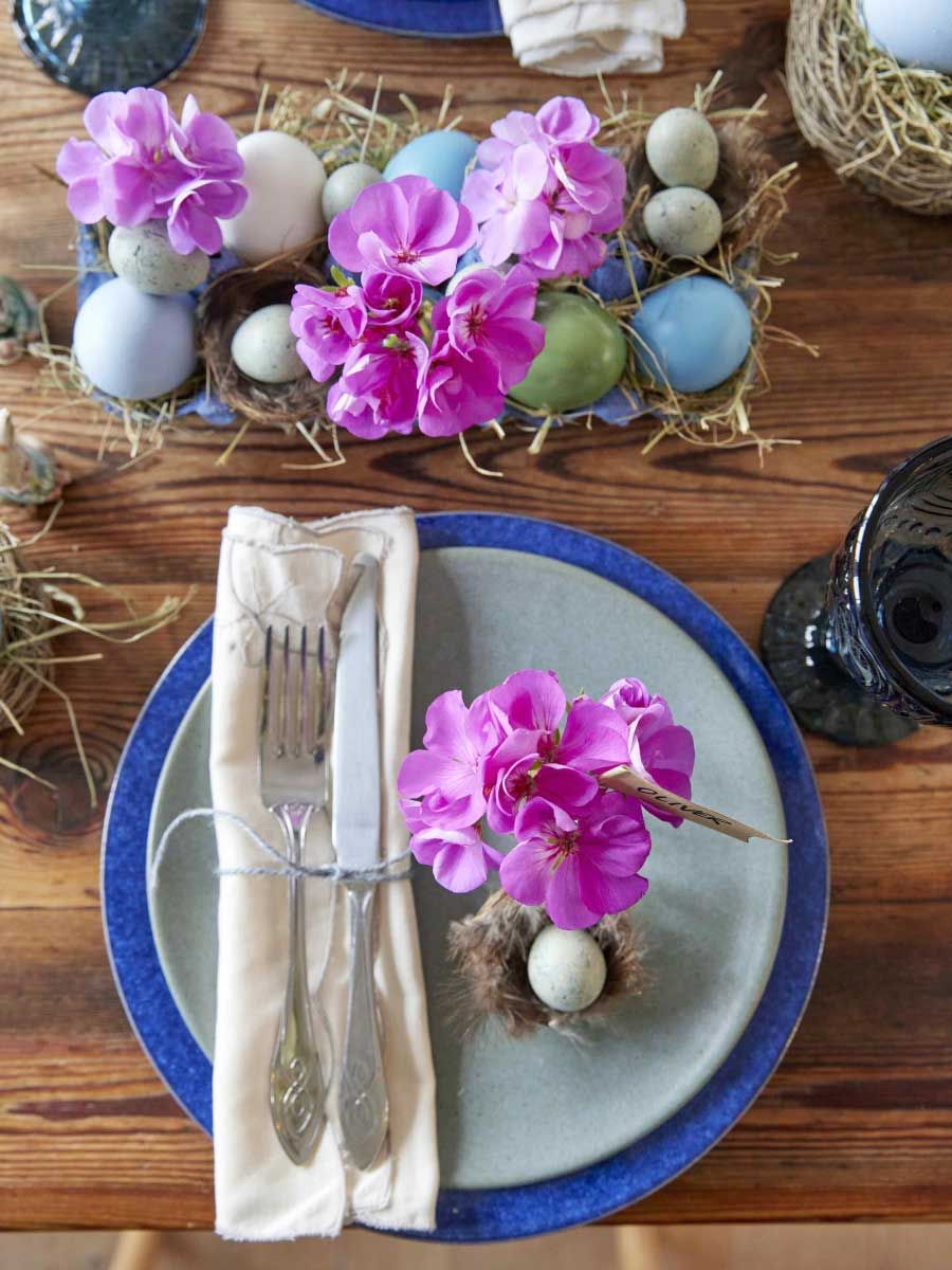 Avec leurs fleurs éclatantes, les géraniums coupés sont les alliés idéaux des tables fleuries de Pâques.. Placés çà et là dans des tubes à fleurs et des petits vases, ils peuvent être utilisés pour décorer les nids de Pâques et créer des décorations festives avec des œufs colorés.