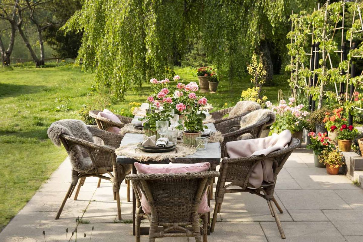 I Géraniums dans les tons de roseen pots, disposés sur un table de jardin de style campagne chicElles créent une atmosphère estivale et apportent de la gaieté. Les pots décorés ajoutent un détail raffiné et mettent les plantes en valeur.