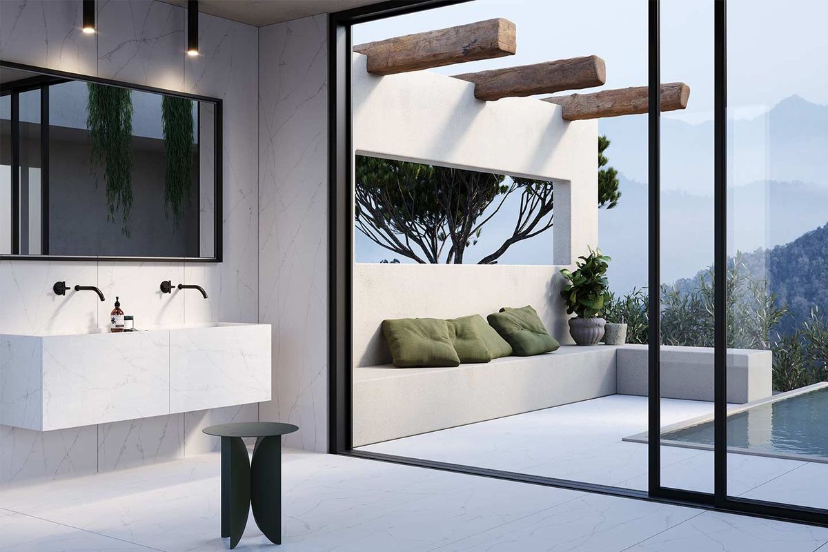 Des tons chauds au blanc absolu, aussi avec des veines dans la collection Musa, à l'intérieur de l'édifice. différentes nuances de gris et de noir. La pierre frittée Lapitec se décline dans la palette par excellence de la salle de bains, où les couleurs naturelles permettent le bien-être personnel.