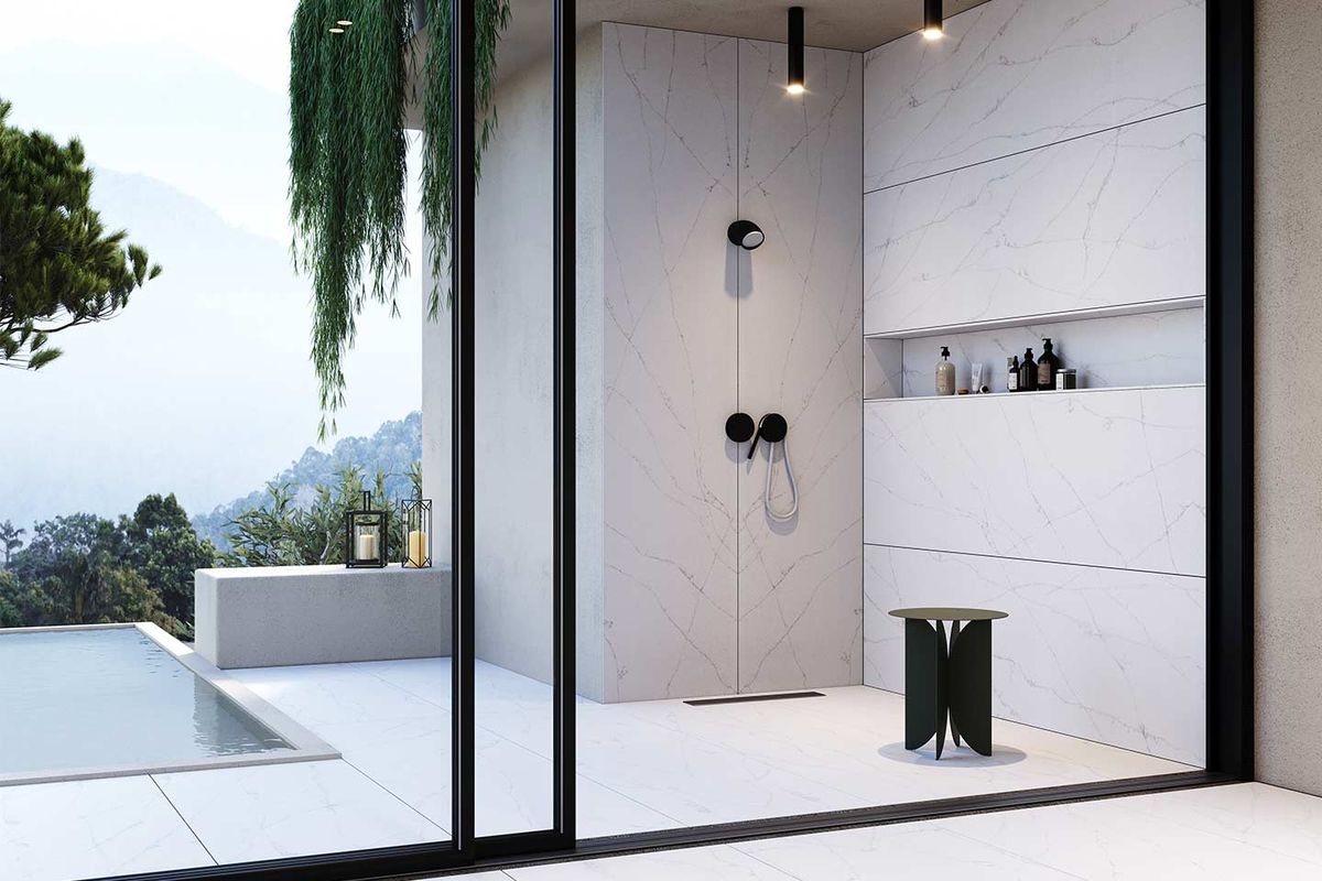 La grande taille des dalles, en format XXL jusqu'à 1540×3440 mm, permet de réaliser des revêtements de douche. Le résultat sera un effet minimal grâce à l'absence de joints et de coulis. De plus, la maniabilité du matériau facilite la personnalisation et la création d'aménagements, même avec des esthétiques et des couleurs différentes.