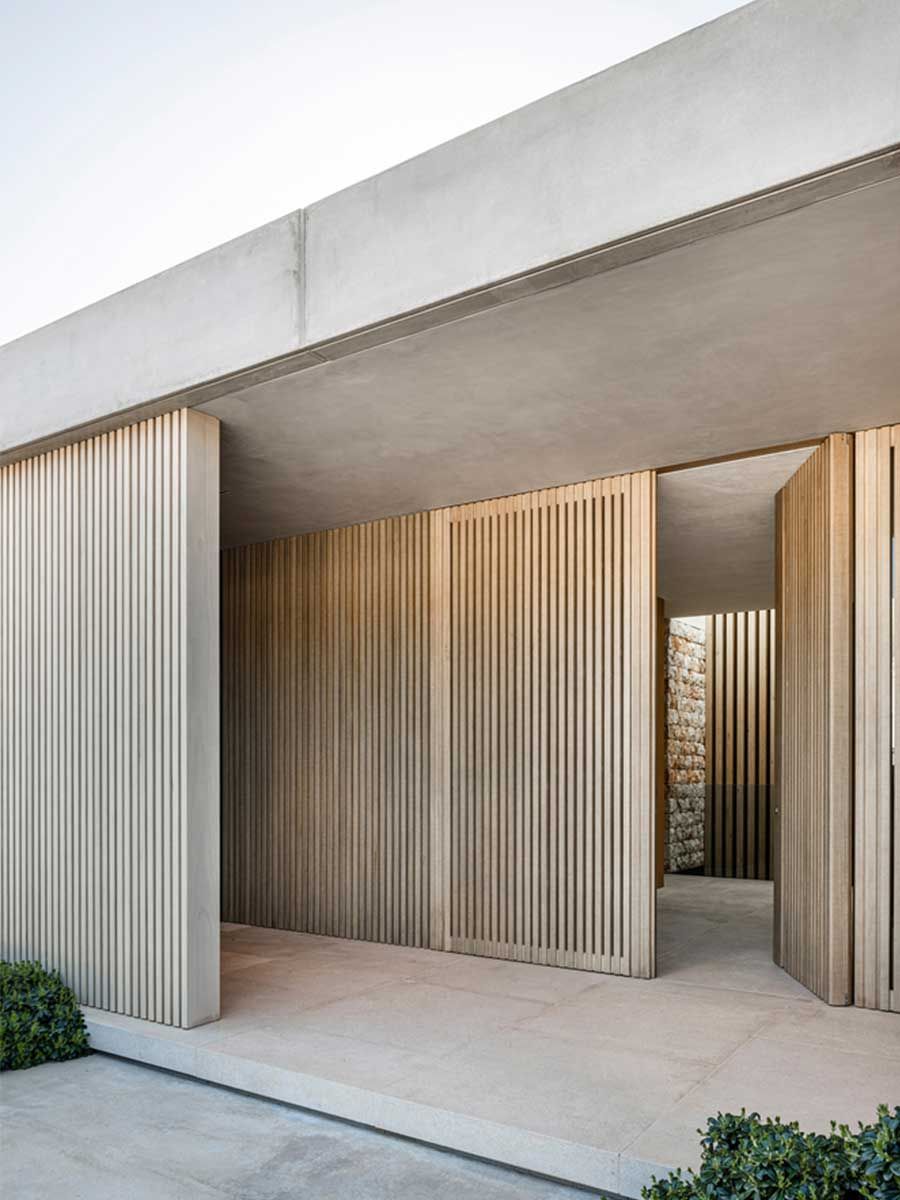 Le volume rectangulaire du bâtiment est caractérisé par des murs en pierre sèche qui rappellent les maisons méditerranéennes. Le studio a utilisé à la fois la pierre d'une carrière locale et les techniques traditionnelles de construction en pierre sèche. En conséquence, l'extérieur de la maison est texturé, avec des textures naturelles et des tons clairs. De grandes fenêtres, placées en retrait, créent des zones ombragées pour garder l'intérieur frais par temps chaud. Les architectes ont également créé un système de ventilation naturelle qui permet à l'air frais de circuler dans la maison jusqu'aux puits de lumière. En même temps, la façade avec de grandes fenêtres permet à la chaleur de s'accumuler pendant l'hiver.