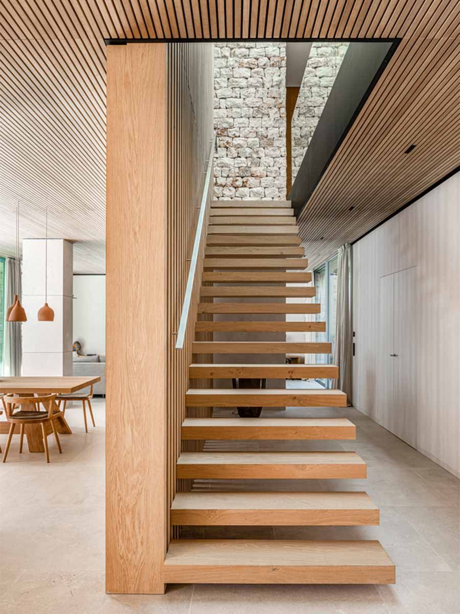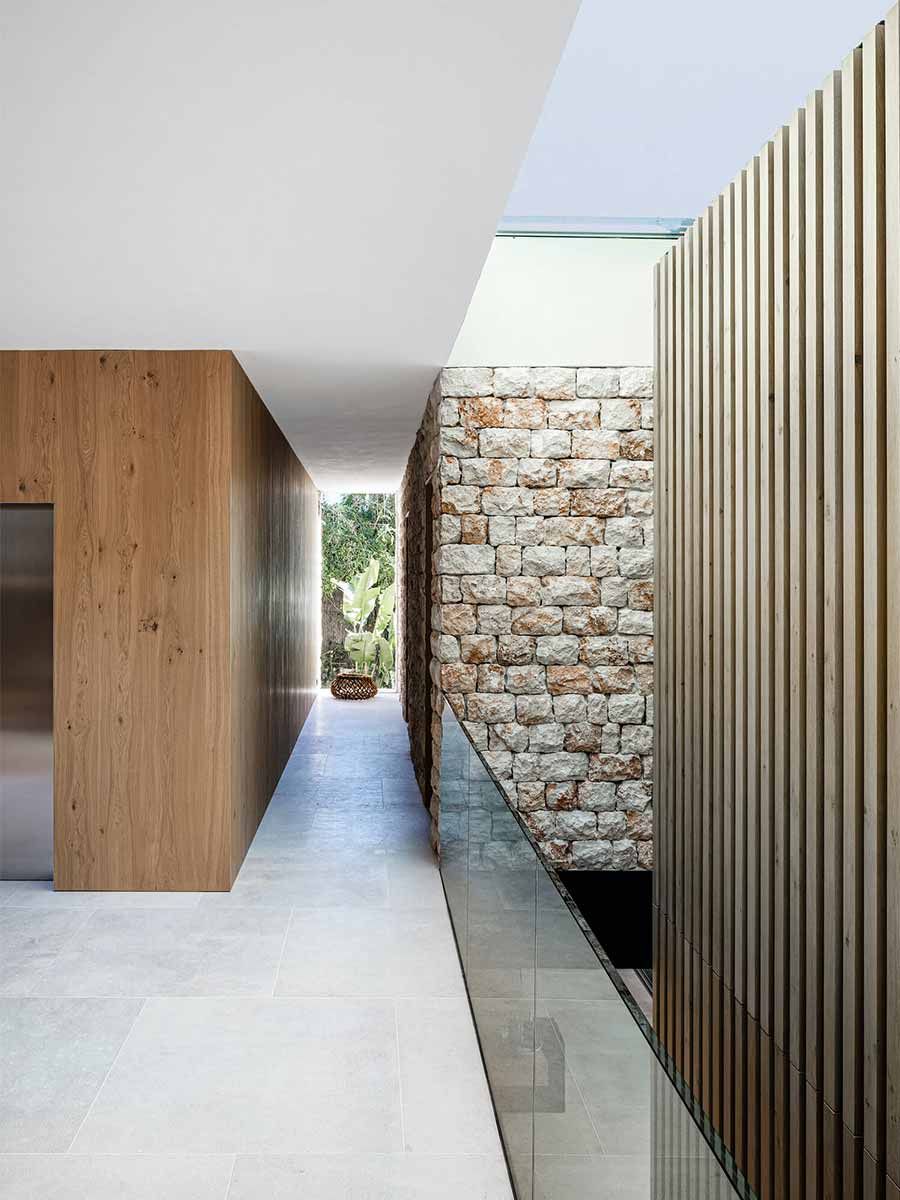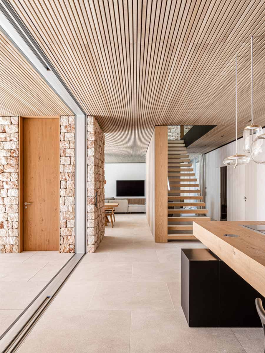 Les volets pliants en bois à lames étroites et verticales rappellent les maisons traditionnelles de Majorque et créent un jeu d'ombre et de lumière dans l'intérieur. Grâce à l'espace entre les lames, les volets permettent à l'air de pénétrer dans l'espace de vie, même lorsqu'ils sont fermés. Les murs en pierre sèche s'invitent également à l'intérieur. Ici, ils complètent les murs avec un enduit traditionnel à la chaux. L'intérieur est meublé de meubles en bois faits sur mesure, de surfaces en pierre et d'un bel éclairage. D'élégantes lampes suspendues en céramique faites à la main éclairent la salle à manger, tandis que dans la salle de bains moderne, des lampes boules illuminent la baignoire autoportante la nuit.