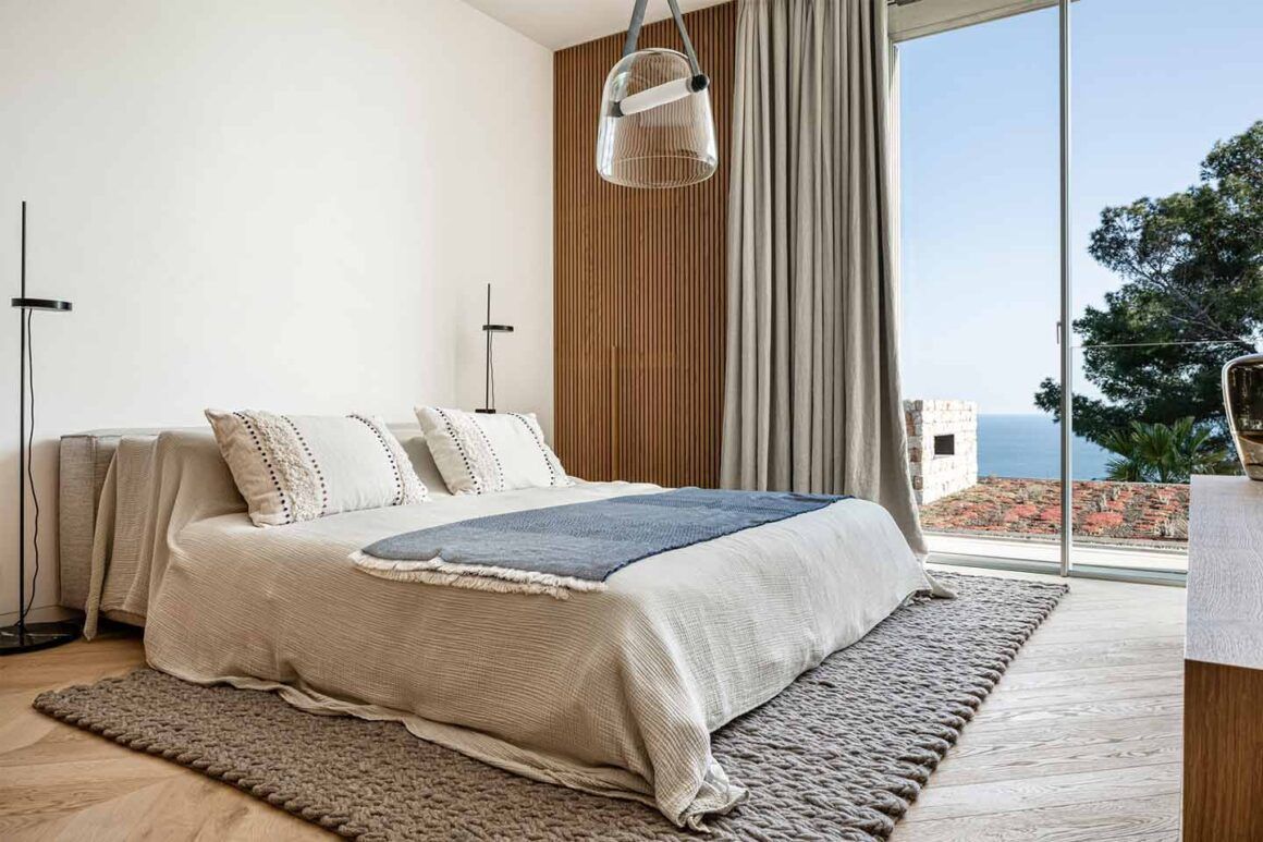 Chaque étage bénéficie d'une vue sur le paysage extérieur. Le rez-de-chaussée surplombe la mer tandis que l'étage supérieur offre une vue splendide sur la ville. Mais cette maison contemporaine offre une autre vue, celle de la piscine à débordement, où l'eau se mêle à la mer et à l'horizon.