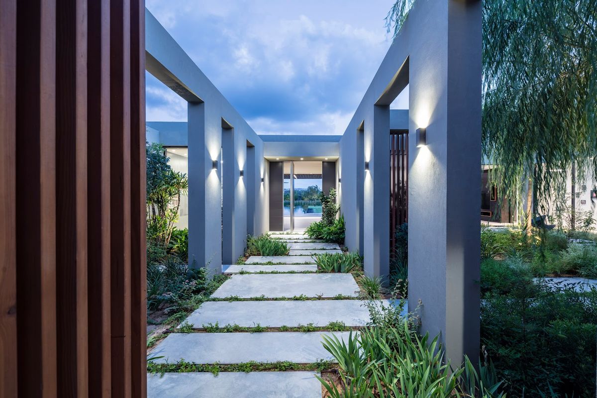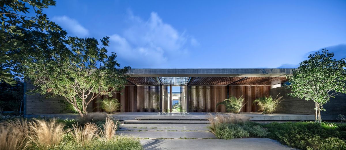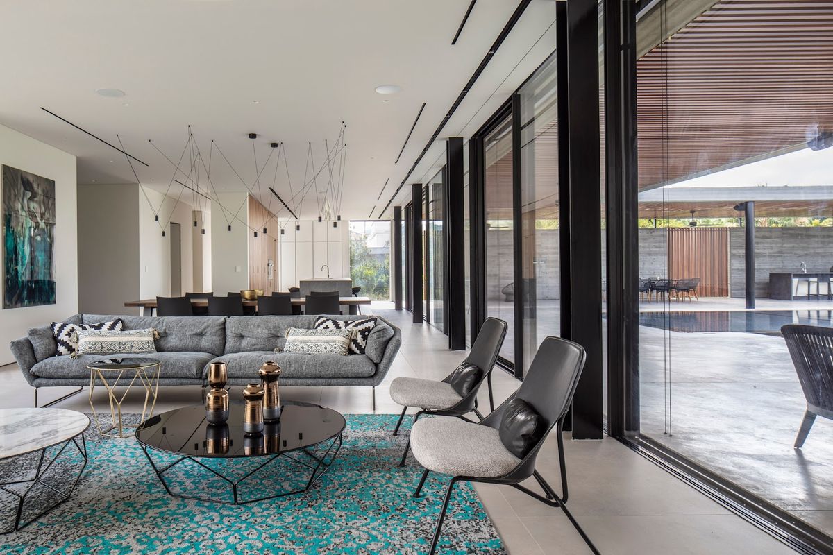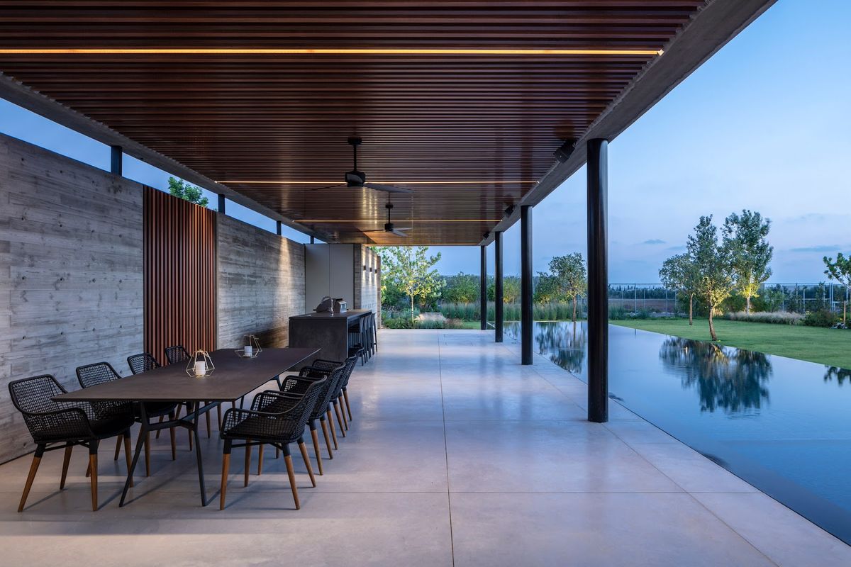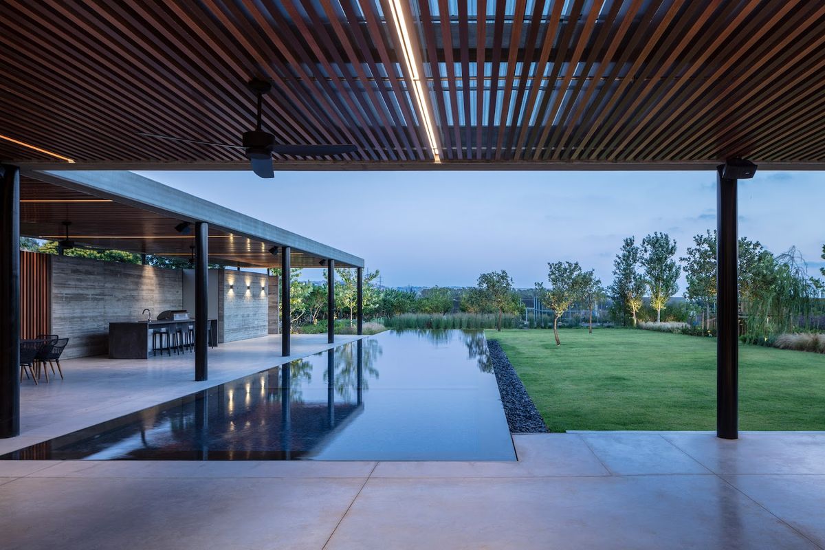 Cette maison est née en réponse au besoin d'un environnement accueillant en contact avec la nature tout en garantissant l'intimité des habitants. Israelvits Architects a tiré parti du terrain plat en optant pour une structure en L qui adopte un caractère introverti et s'ouvre sur un grand jardin, laissant la façade extérieure fermée aux passants. Une fois à l'intérieur de la propriété, les visiteurs se retrouvent dans un grand jardin luxuriant qui révèle progressivement la maison.La propriété comprend un court de tennis, une piscine et un verger intégré à la nature environnante ; des patios et divers petits jardins créent des coins naturels surprenants.
