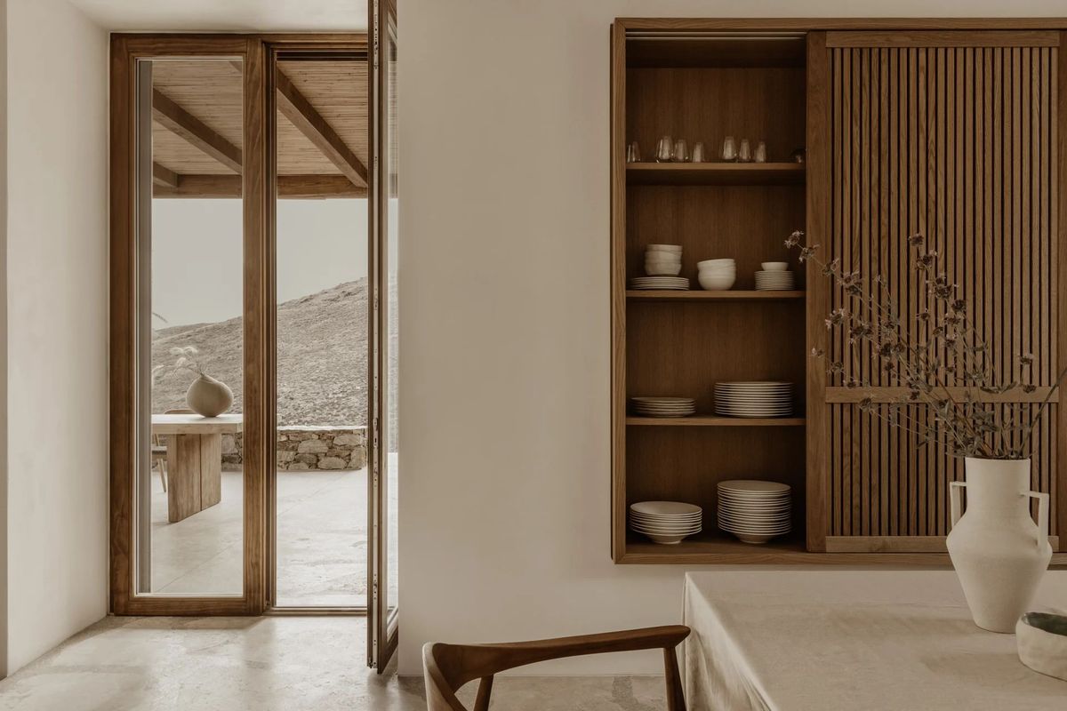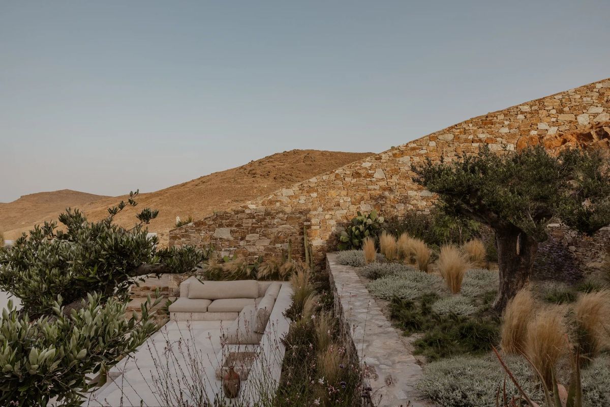 De loin, la villa ressemble à un village insulaire traditionnel accroché aux pentes rocheuses au-dessus de la mer Méditerranée. sur les pentes rocheuses au-dessus de la mer Méditerranée, les concepteurs ont combiné des formes des formes minimalistes, des matériaux naturels et des couleurs neutres pour de la maison en s'inspirant de la typologie des petits villages de la villages de la mer Égée : constellations minimalistes de volumes bas, souvent souvent éparpillés sur les collines, tournés vers la mer.