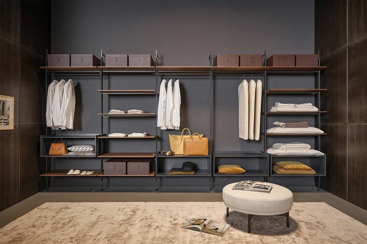 La Meuble à roulettes s'inspire de la bibliothèque du même nom conçue par Dondoli et Pocci. A un meuble fonctionnel et un effet scénique important, conçu avec des proportions, dimensions et accessoires adaptés à la fonction de dressing. Le dressing est complètement ouvert, conçu pour des solutions linéaires avec fixation murale : sa structure est en plomb, tandis que les étagères peuvent être en bois laqué couleur plomb ou en noyer Canaletto pour un contraste élégant. Les volumes tels que le meubles de rangement en bois et boîtes de rangement peu encombrantespeuvent être positionnées selon les besoins.